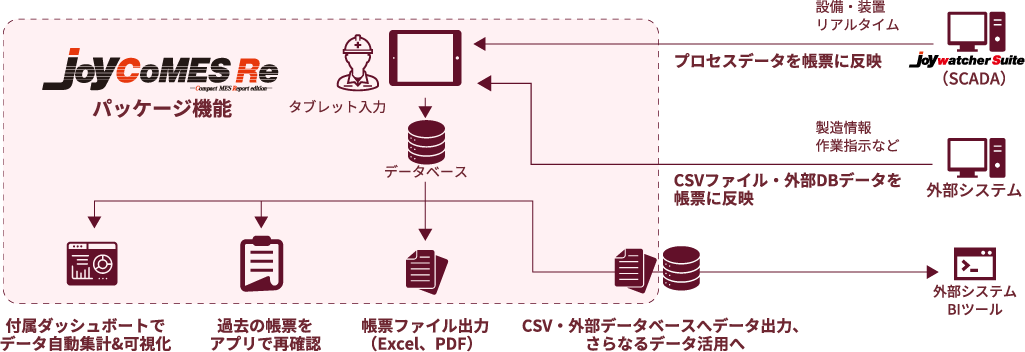 - ● JoyCoMES Reには、実績データを見える化するツール及び外部システムとの
