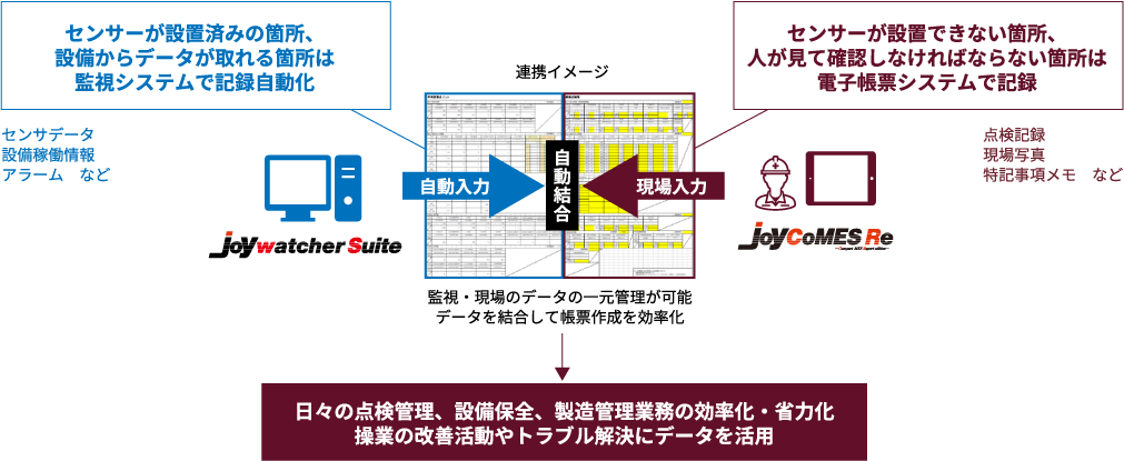 - ●JoyWatcherSuite(自動監視システム)と、JoyCoMES Re(電子帳票)を組み合わせる